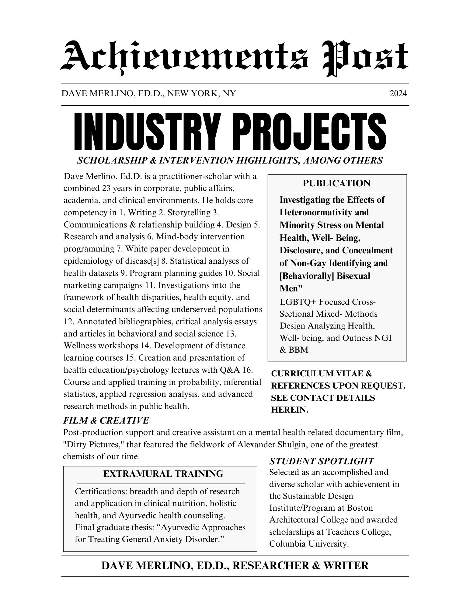 π¨β€οΈπ¨ LGBTQ+ healthMy current academic research focuses on what I've termed "fringe" LGBTQ+, such as closeted, questioning, straight/masculine presenting, behaviorally bisexual, non-gay identifying, and/or some derivative of sexually interactive with men (SIM) populations, and how heteronormative culture and [toxic] masculinity moderate their "outness," health, and well-being. Relatedly, I've upheld my dissertation defense, "Investigating the Effects of Heteronormativity and Minority Stress on Mental Health, Well-Being, Disclosure, and Concealment of Non-Gay Identifying and [Behaviorally] Bisexual Men" (see below).Iβve earned my Doctor of Education (Ed.D.) in Health and Applied Educational Psychology from Teachers College, Columbia University. Further, I have an M.A. in Health Promotion, Certificate of Graduate Study in Sustainable Community Planning and Design, a B.A. in both Economics and International Relations, and 500 and 600 hour certifications in clinical nutrition and Ayurvedic health counseling, respectively.If you want to get to know me personally, follow me on www.ko-fi.com/davemerlino. πΊπΏThank you for being here! π